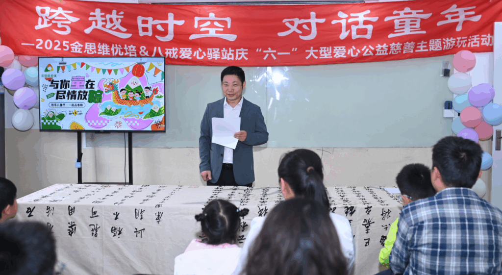 2025 年 6 月 1 日,由上海金思维培优联合中一投趣八戒集团,共同主办的 “爱心八戒,为爱圆梦 —— 我们在路上” 大型公益活动在金思维培优校区温情举行。本次活动以 “爱心八戒,携你“童”行” 为主题,聚焦少年儿童身心健康,通过文化体验、亲子互动、物资捐赠等多元形式,为孩子们打造了一个充满爱与关怀的六一儿童节。
