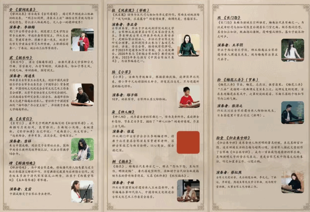 演奏曲目:琴歌弹唱《凤求凰》:该传为汉代司马相如为卓文君所作。琴曲生动地演绎了“凤飞四海,求其凰兮”的爱情故事,曲调优美,意蕴深长。