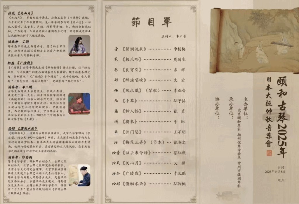2025金秋琴香的大阪,迎来誉为“太古之音”“天地之华”的古琴音乐会,于11月5日下午,隆重举办一场““颐和”古琴音乐会,在日本大阪市中心剧场成功举行。本次颐和古琴音乐会由著名古琴家周通生组织,古琴文化学者邸聆桐致辞,来自全国各地的琴家李三鹏,于琳,李杨梅,王芊玥,邸子铭、李正音,刘吉祥,蔡红燕等纷纷登台亮相,都有精彩表现。