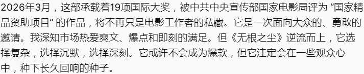 我是00后,一名电影宣传工作者。我的工作是将故事翻译成热搜、话题和情绪爆点。直到我遇见王志平导演的《无根之尘》,我所有所谓的宣传套路和技巧彷佛都失效了,我像一个被卸除了武器的士兵,只剩下最原始的沉浸与沉默,因为这不是一部可以用对标作品或情绪赛道来归类的电影。